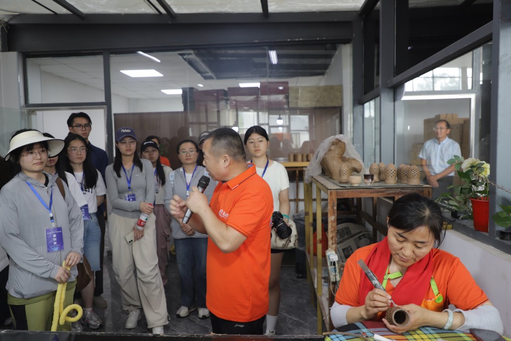 龍格黑陶藝術(shù)研究院內(nèi),傳統(tǒng)工藝與現(xiàn)代創(chuàng)新的完美融合。省級非物質(zhì)文化遺產(chǎn)項目代表性傳承人徐慶增老師帶領(lǐng)師生們參觀黑陶生產(chǎn)車間,他特別提到,濟(jì)陽黑陶以黃河泥為原料,經(jīng)選土、拉坯、雕刻、燒制等20余道工序制成,其“黑如漆、亮如鏡”的獨特質(zhì)感源于高溫窯變的自然反應(yīng)?,F(xiàn)場演示了拉坯、雕刻技藝,手中的陶土仿佛被賦予了生命,在指尖的舞動下逐漸成型。師生們在專業(yè)藝人的指導(dǎo)下,從揉泥、拉坯到成型,親自體驗了黑陶的制作,最終創(chuàng)作出了屬于自己的黑陶作品。