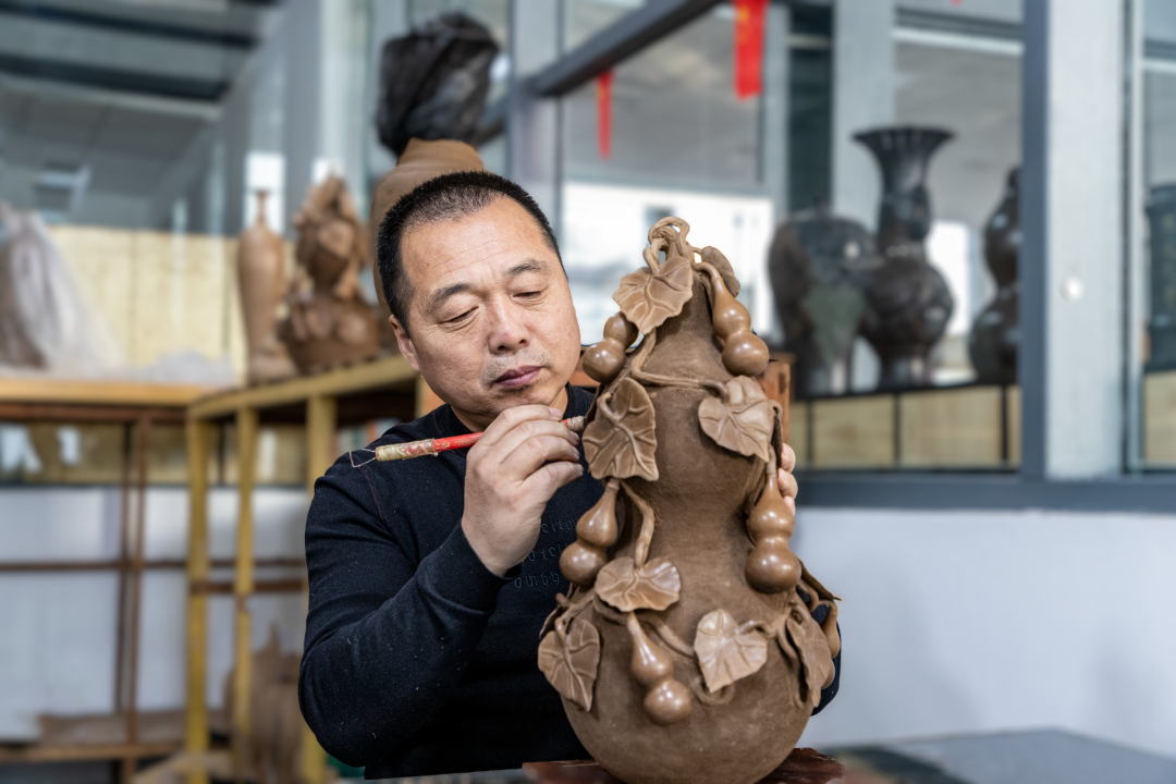 黑陶是華夏先民的黑色詩(shī)篇,作為土生土長(zhǎng)的濟(jì)陽人,三十余載光陰里,徐慶增潛心研究黑陶,續(xù)寫這光輝的詩(shī)篇。如今,他的作品早已超越實(shí)用范疇,成為兼具藝術(shù)價(jià)值與文化厚度的非遺名片。《龍騰盛世》以華夏龍為魂,將泥與火的淬煉推向極致。《福壽葫蘆》造型圓潤(rùn)飽滿,釉色沉郁如墨玉,無需多言,一抹玄色間,福氣已悄然落定?!豆淖友砀琛穭t將田間地頭的歡騰瞬間凝固于陶面,讓人仿佛聽見咚咚的鼓點(diǎn),看見祖輩們?cè)邳S河邊舞出的煙火人間。這些凝聚著心血的創(chuàng)作,不僅是他個(gè)人的藝術(shù)成就,更成為高校非遺教學(xué)中鮮活的教材。